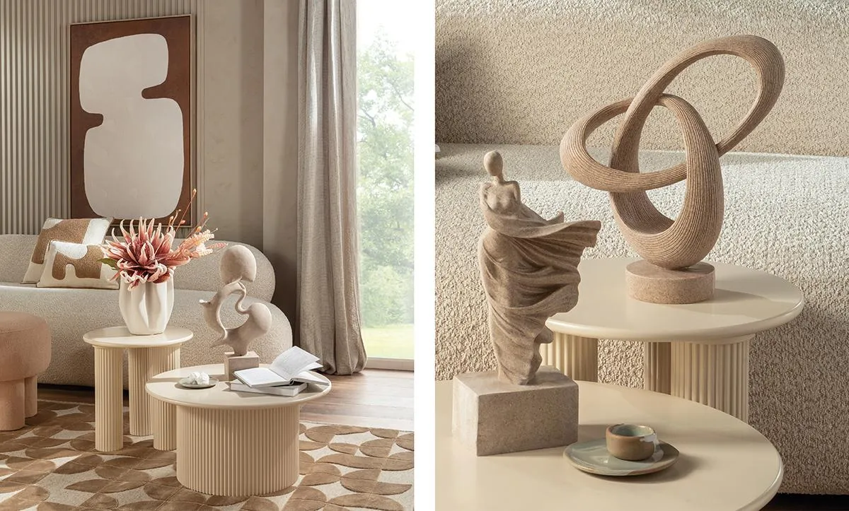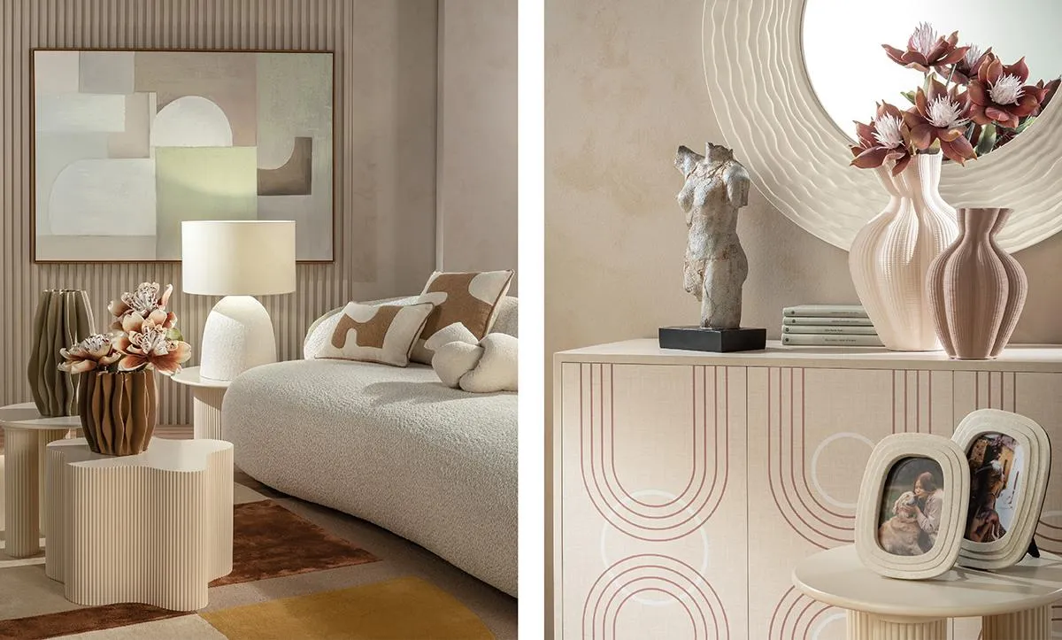 Questa estetica si traduce in un connubio di materiali pregiati, finiture ricercate e tonalità sofisticate: superfici in gesso, pietra calcarea e tessuti bouclé accentuano la matericità delle forme, mentre inserti in ottone spazzolato e ceramica lavorata aggiungono un tocco di brillantezza e tradizione artigianale; il calore naturale delle neutralità terrose si prestano a valorizzare i dettagli di arredi scultorei, tavolini materici e sedute avvolgenti.