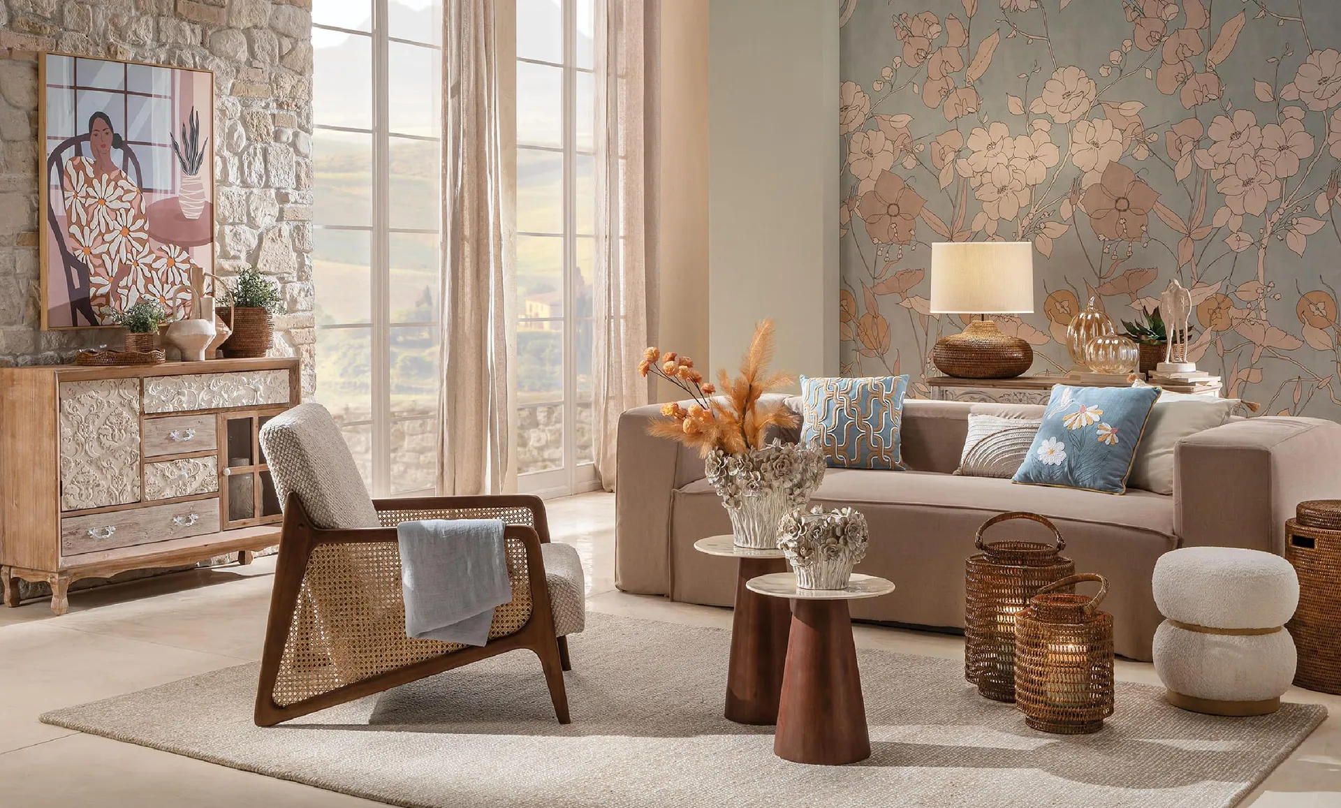 Oggetti artigianali, superfici materiche e dettagli decorativi ispirati a tradizioni diverse costruiscono composizioni dal carattere cosmopolita, dove l’eleganza nasce dall’equilibrio tra autenticità e ricerca estetic****a.