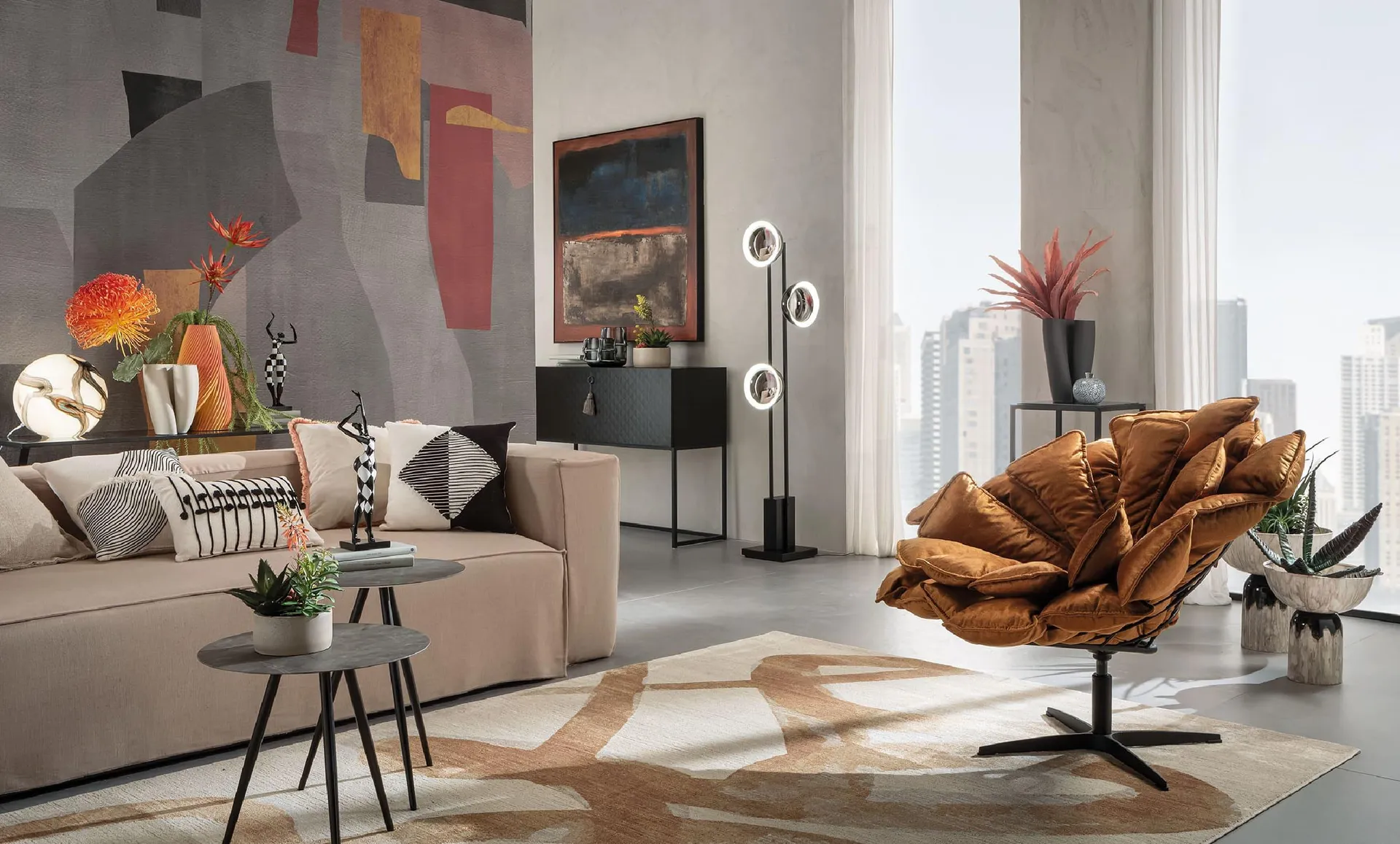 Protagonisti sono i materiali che catturano la luce come metalli galvanizzati, vetri lavorati e superfici laccate, accostati a tessuti preziosi e palette cromatiche decise. Ogni oggetto è scelto per la sua capacità di farsi notare, trasformando il soggiorno in uno spazio sofisticato e vibrante, dove il design dialoga con l’alta moda.