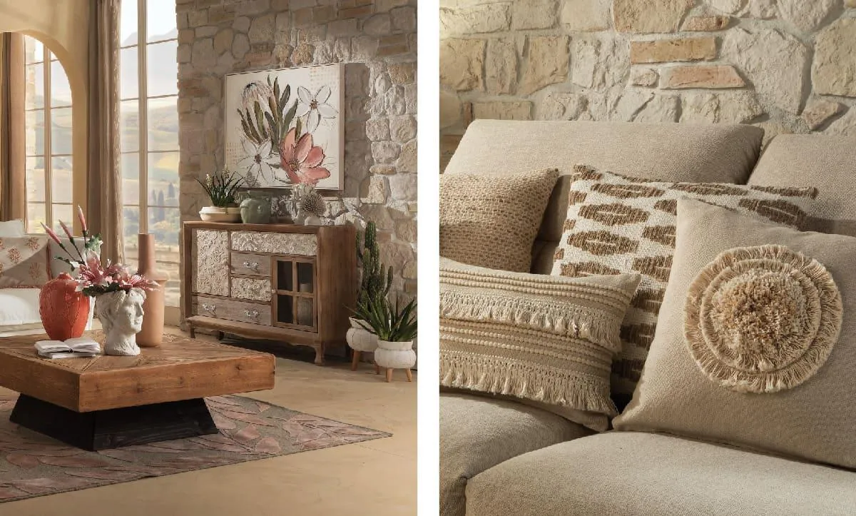 Il tocco in più? I cuscini impreziositi da bordi irregolari o frange delicate. Sono una vera celebrazione dell’artigianalità, testimonianze di un passato fatto di amore per il lavoro manuale e di attenzione per il dettaglio, la cui studiata imperfezione rispecchia la bellezza autentica della campagna.