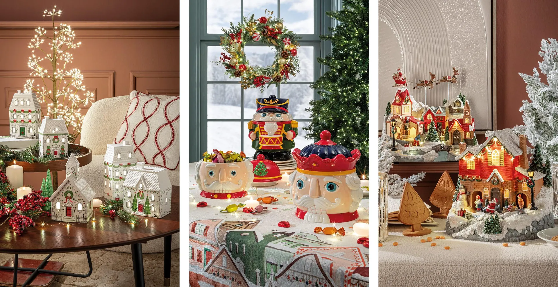 Per un look più giocoso e nostalgico, il tavolo può essere arricchito con un piccolo villaggio natalizio illuminato, con casette finemente decorate che sembrano uscite da una fiaba o con simpatici potiche. Queste creazioni evocano un senso di meraviglia e riportano alla mente la magia dell’infanzia. Perfette per sorprendere grandi e piccoli.