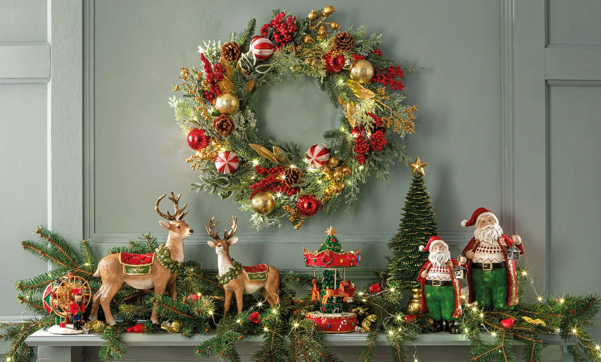 A dare la prima pennellata può essere una ghirlanda di pino, arricchita da bacche, palline e foglie che giocano sull’alternanza di rosso e oro per creare una profonda luminosità. Un addobbo dalla delicatezza vintage e, insieme, una presenza elegante, perfetta per chi ama le decorazioni che uniscono tradizione e modernità.