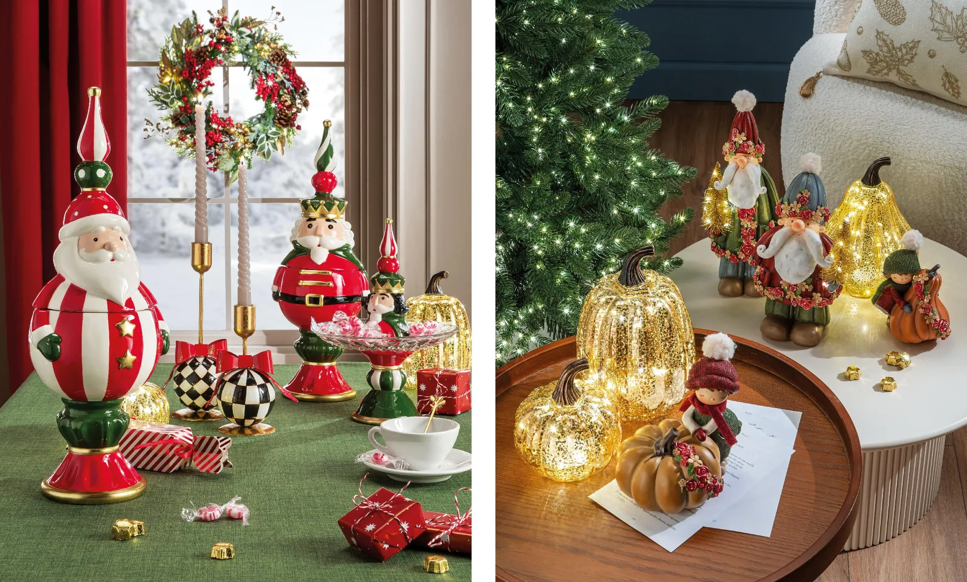 Ad esempio il centrotavola può giocare con l’estetica del racconto fiabesco, tra ceramiche smaltate dai volumi importanti, personaggi iconici come Santa Claus e il soldatino Schiaccianoci, finiture lucide e cromie vivaci.