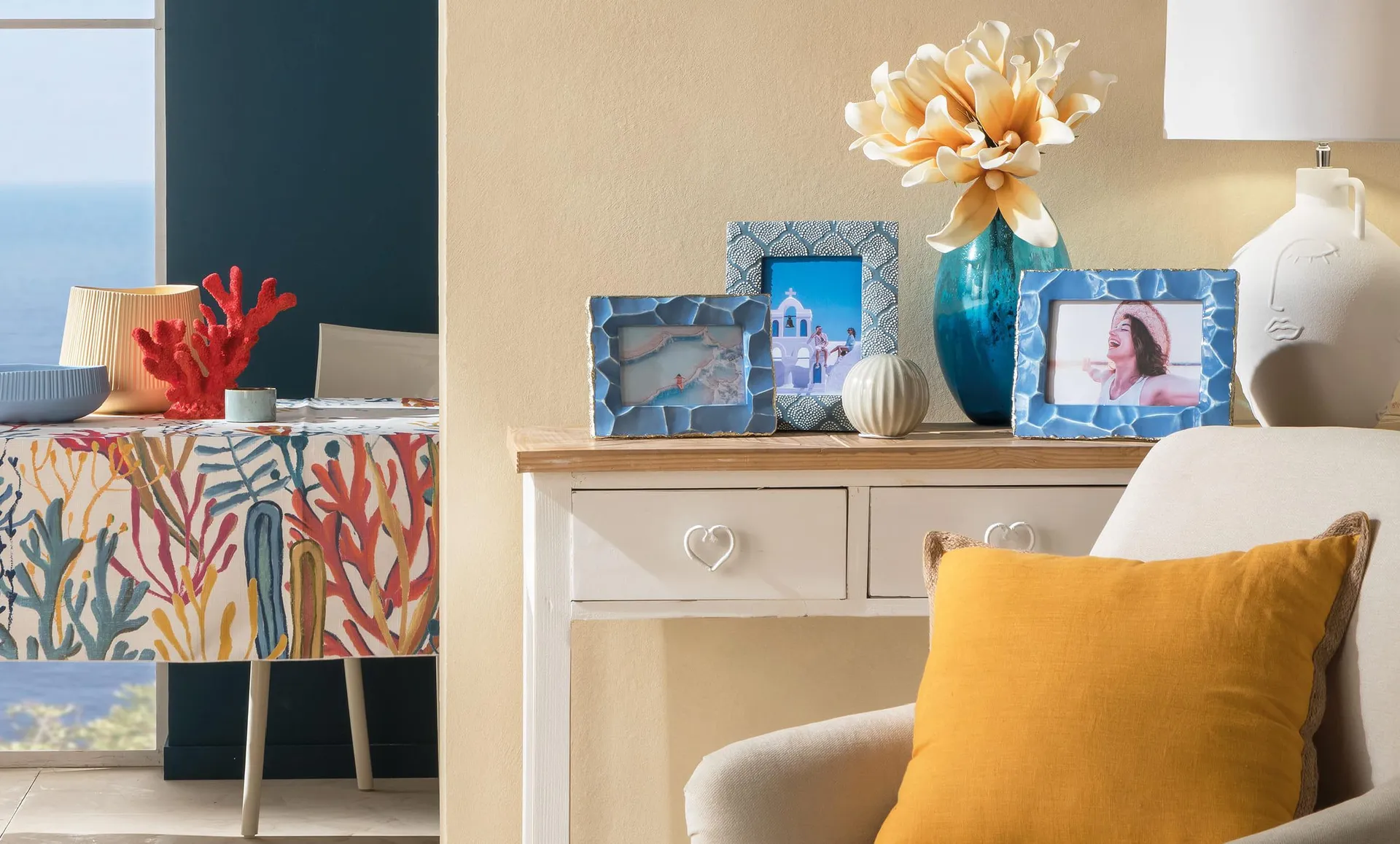 - Le cornici portafoto diventano piccoli paesaggi affettivi, frammenti di vita incorniciati da materiali che richiamano il ritmo organico del mare. Il vetro lavorato, con le sue trasparenze irregolari, evoca il moto dell’acqua sulla sabbia; la ceramica smaltata, nelle tonalità dell’oceano e della conchiglia, restituisce una matericità calda e imperfetta, autentica.