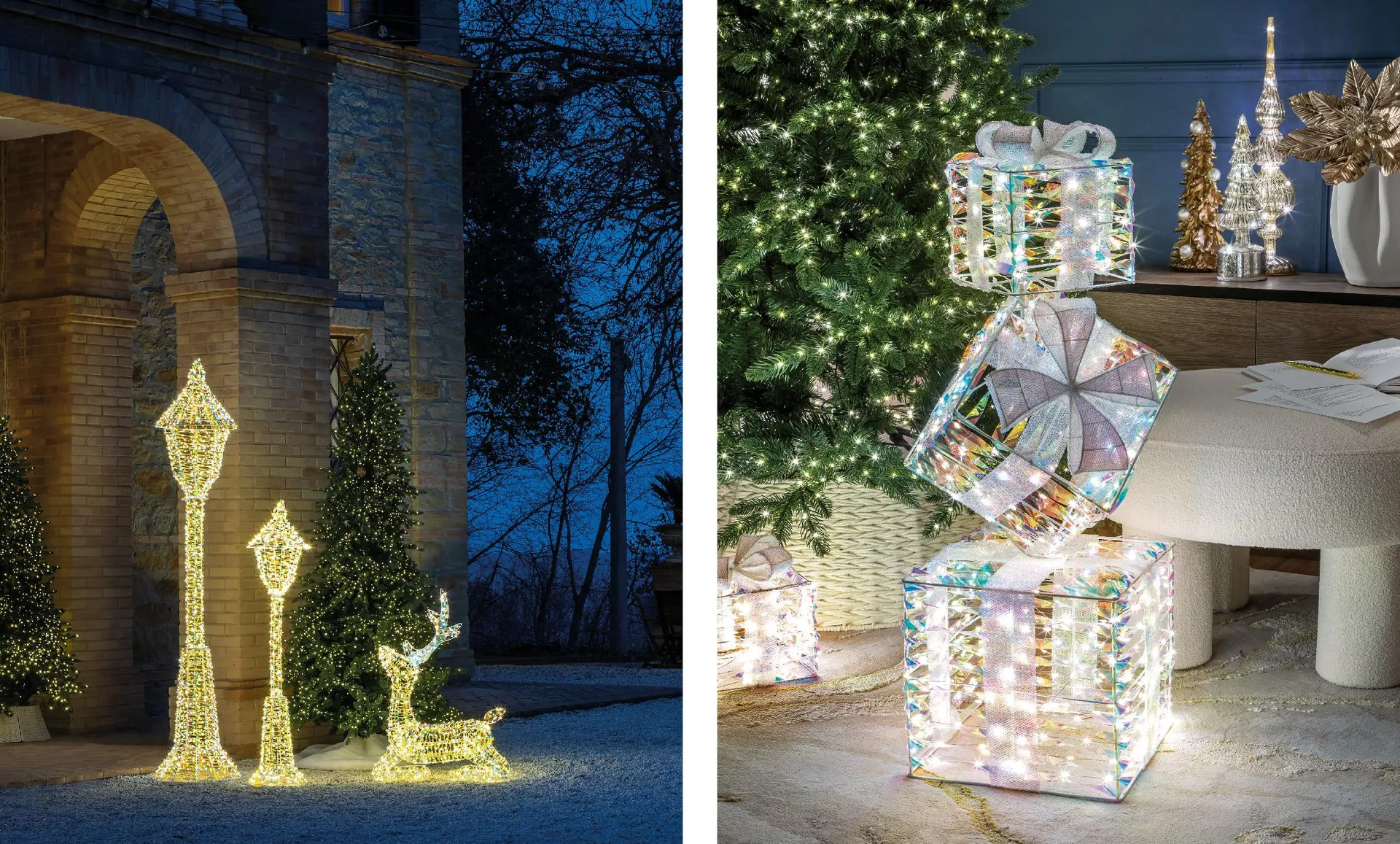 Accanto alla soglia o ai piedi dell’albero esterno, i pacchi iridescenti introducono un accento contemporaneo. Le superfici cangianti rifrangono i micro-LED circostanti e trasformano il suolo in un tappeto di riflessi miele; trattarli come sculture, con base stabile e spazio libero attorno, restituisce loro eleganza e misura.
