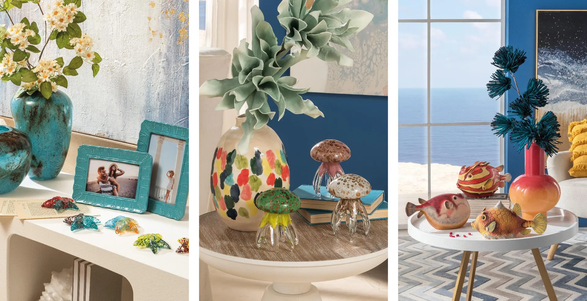 Possono essere pesci dalle cromie audaci, piccoli uccellini di vetro, leggeri come soffi di vento o gechi scintillanti; o ancora tori dalla silhouette scultorea, dolci stelle marine o meduse eteree… Gli animali usati come articoli decorativi per la casa aggiungono una dimensione poetica agli interni, grazie al loro carattere di narratori silenziosi di storie.