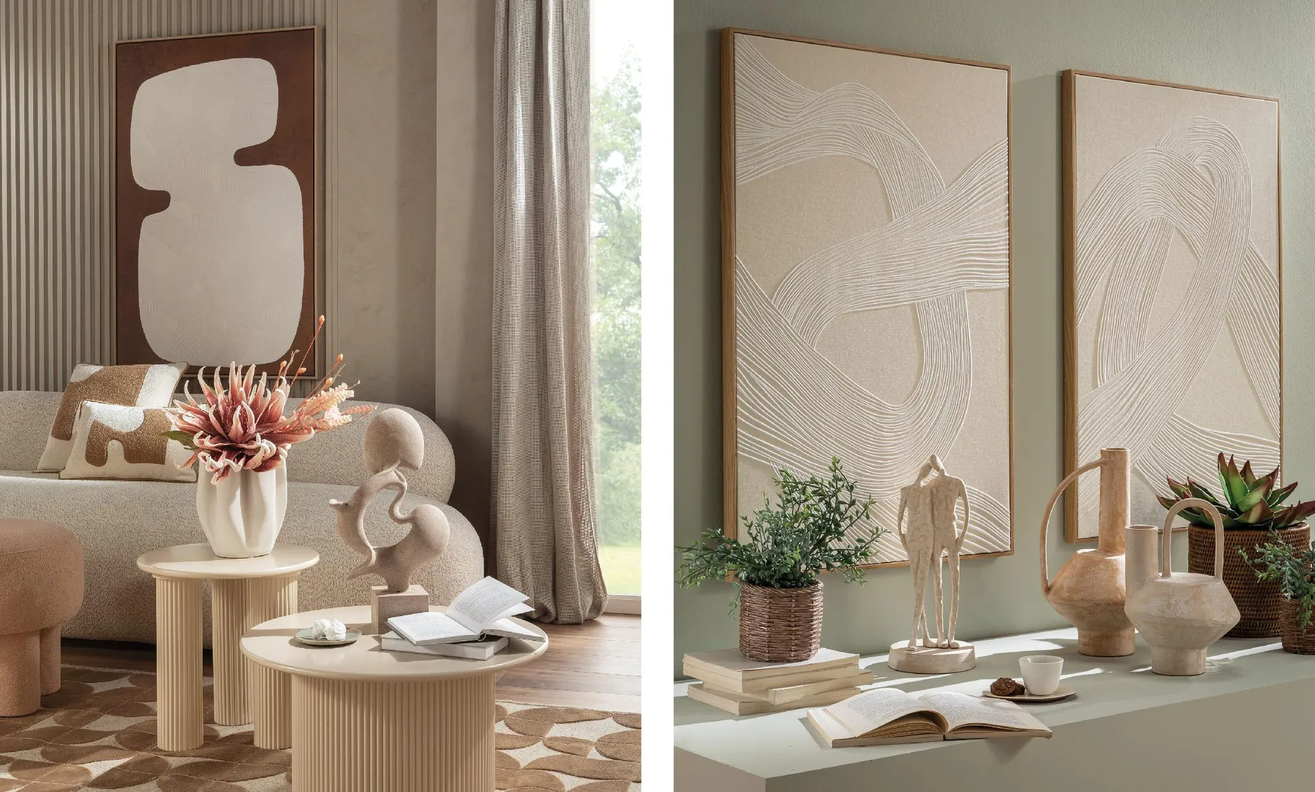 La nuance** si integra perfettamente anche in sculture decorative e vasi in gesso ceramico, dal profilo organico o brutalista, che vestono gli spazi con un’eleganza silenziosa.
