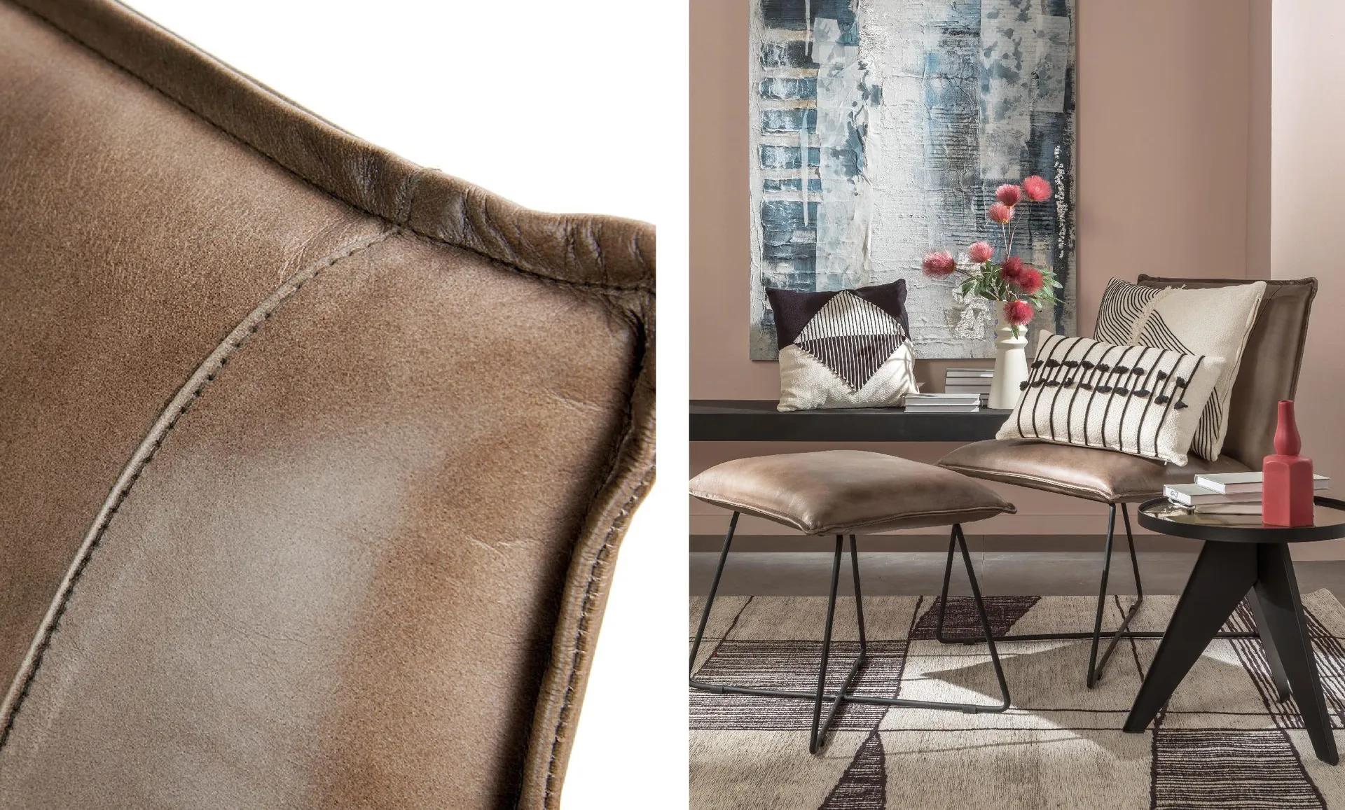 Perfetta per interni industrial-chic o moderni, si inserisce con disinvoltura in angoli dedicati al relax che esalta con la forza della sua leggerezza. Il poggiapiedi coordinato aggiunge un ulteriore livello di comfort, mentre il rivestimento in pelle lavorata dona profondità tattile e visiva.