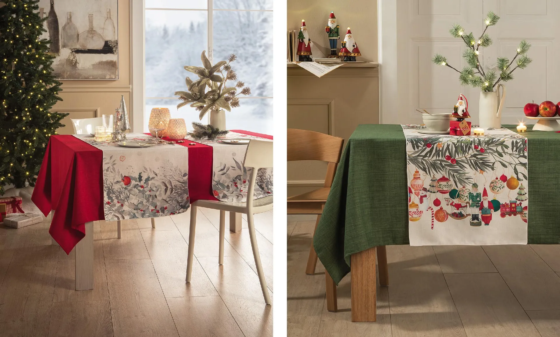 Tra le proposte più eleganti e contemporanee, c’è sicuramente la tovaglia tinta unita. Sempre raffinata soprattutto se scelta in colori che richiamano la tradizione come il rosso o il verde. Ma se si vuole qualcosa in più, l’abbinamento con un runner a fantasia natalizia può essere l’idea giusta per innovare senza perdere di vista la tradizione.