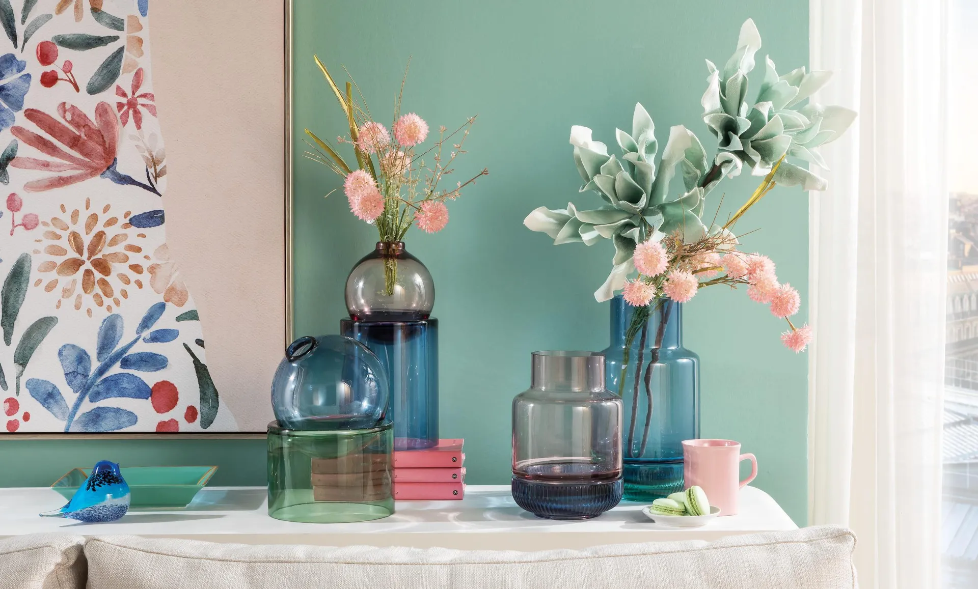 Da quelli che esprimono una femminilità floreale e sontuosa, come i vasi in ceramica decorati con maxi peonie in nuance cipria e sabbia, a quelli che parlano il linguaggio più contemporaneo del vetro colorato, per arrivare ai vasi su piedistallo, il vaso si trasforma in accessorio d’arredo che cambia il ritmo della stanza, che introduce colore, che parla di chi abita con gusto e leggerezza. E che — proprio come un buon profumo o una borsa iconica — non passa inosservato.