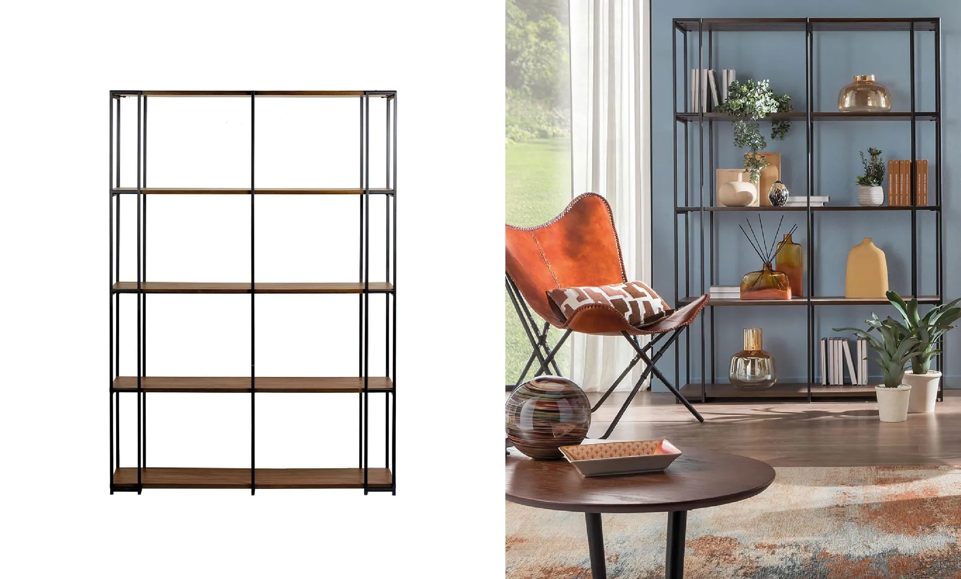 - la libreria espositore, con il suo mix di legno e metallo, dona un fascino industriale, perfetto per un angolo studio in un soggiorno moderno;
