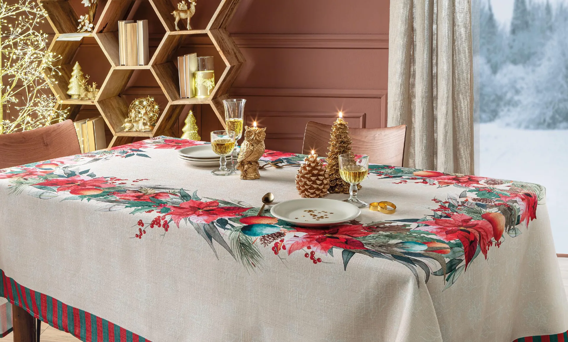 Se invece si vuol puntare su un’esplosione di colori natalizi, la tovaglia con bordi di stelle di Natale è la scelta perfetta, per evocare tutta la magia delle feste con una vivacità raffinata.