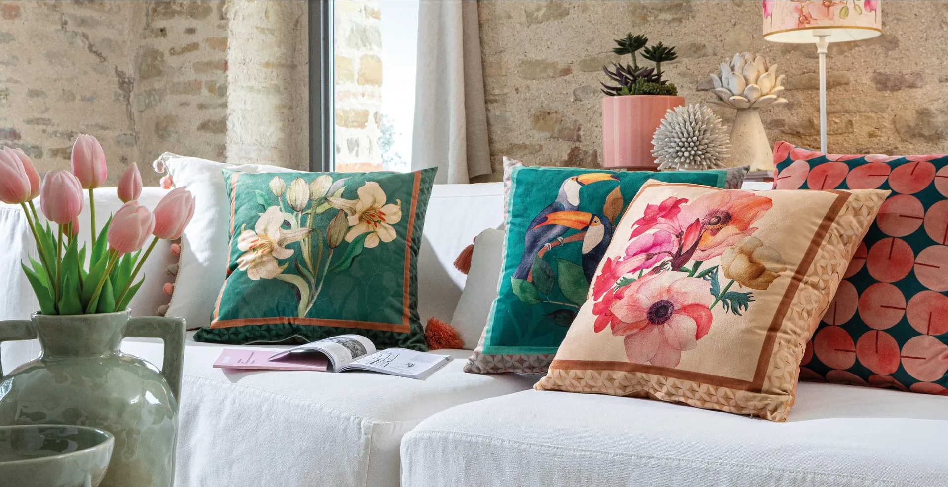 I cuscini, con le loro stampe ispirate alla natura, dai vivaci tucani ai delicati gigli orientali, aggiungono non solo comfort ma anche un tocco di poesia visiva. Realizzati in tessuto di alta qualità, si presentano come una celebrazione di texture e colore, capace di trasformare un semplice divano in un’oasi di eleganza.