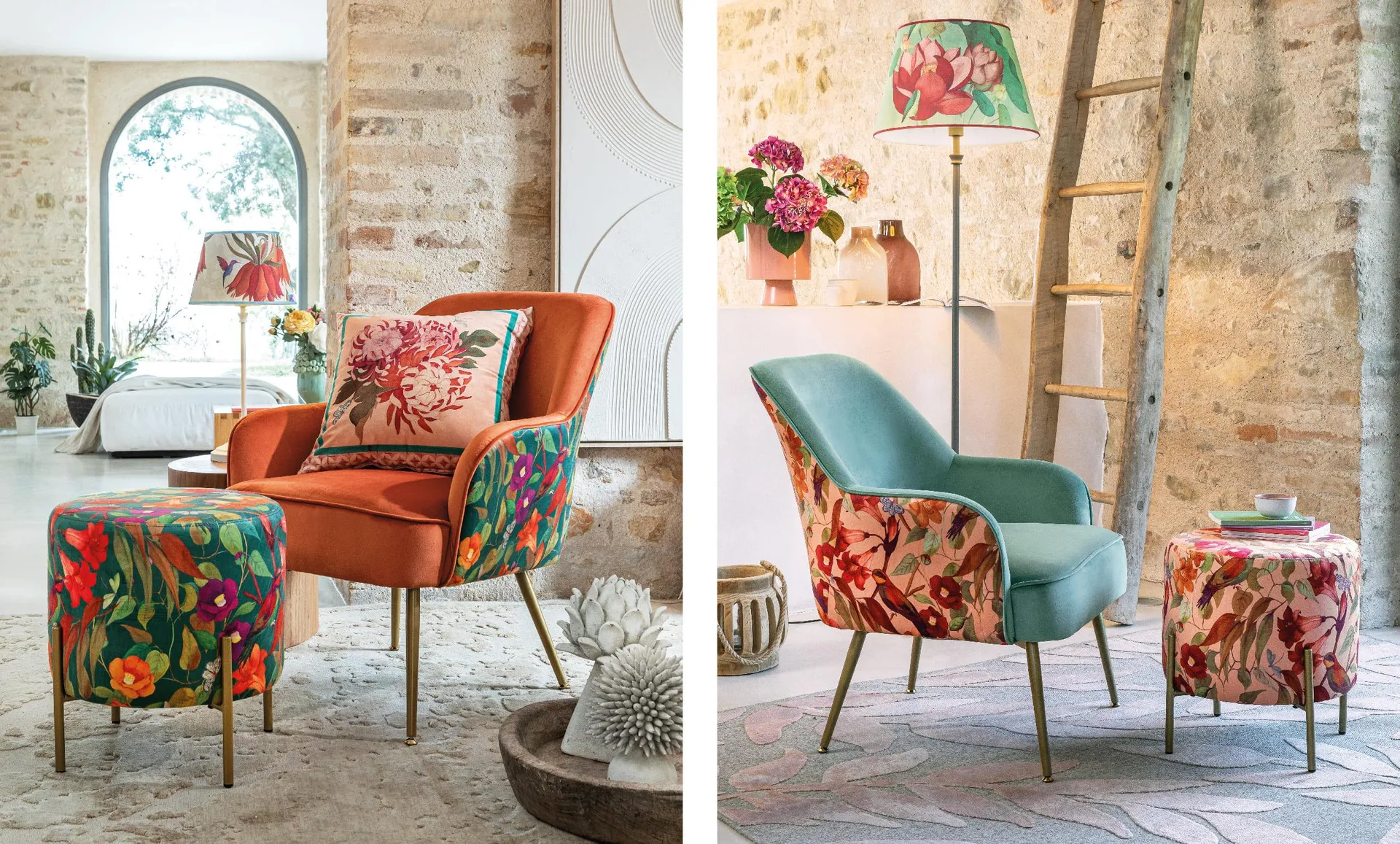 È il caso dell’associazione poltrona e pouf che L’Oca Nera interpreta in maniera preziosa giocando con texture e colori che invitano a sedersi come su un prato fiorito.