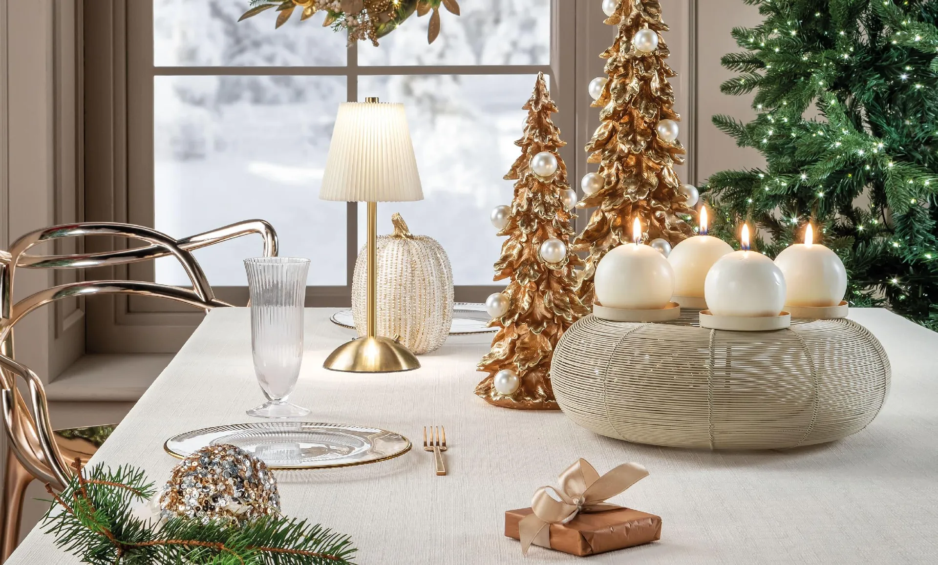 Perfette le candele bianche, raccolte in una composizione centrale in metallo e affiancate da alberelli decorativi oro. Tutto è costruito per sottrazione, nulla è eccessivo, ogni cosa concorre ad una coerenza stilistica.