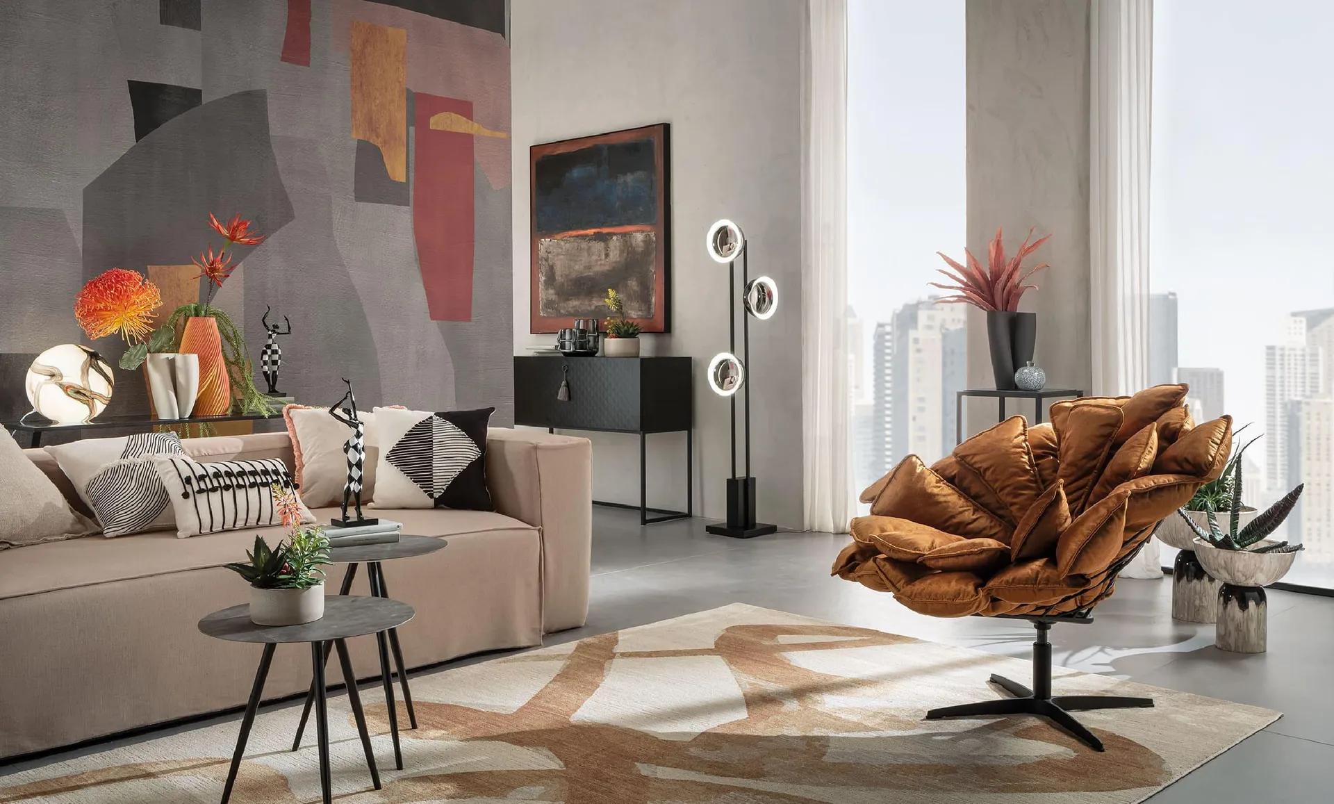 Ma il cuore dello spazio è la scenografica poltrona a fiore, in color rame bruciato: un pezzo statement che dona calore e sensualità all’ambiente, ammorbidendo l’austerità urbana con un tocco teatrale.