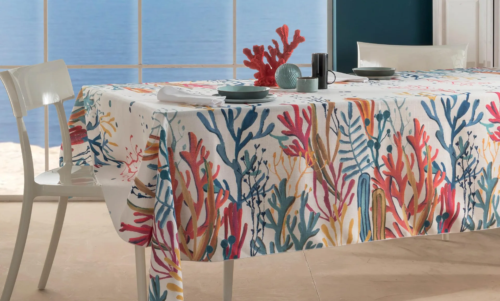 Sulle tavole, le tovaglie si trasformano in vere e proprie tele: un tripudio di coralli disegnati a mano, pennellate vibranti in rosso, arancio, senape e blu, che portano sulla superficie dell’arredo il movimento e la vitalità del mondo sottomarino.