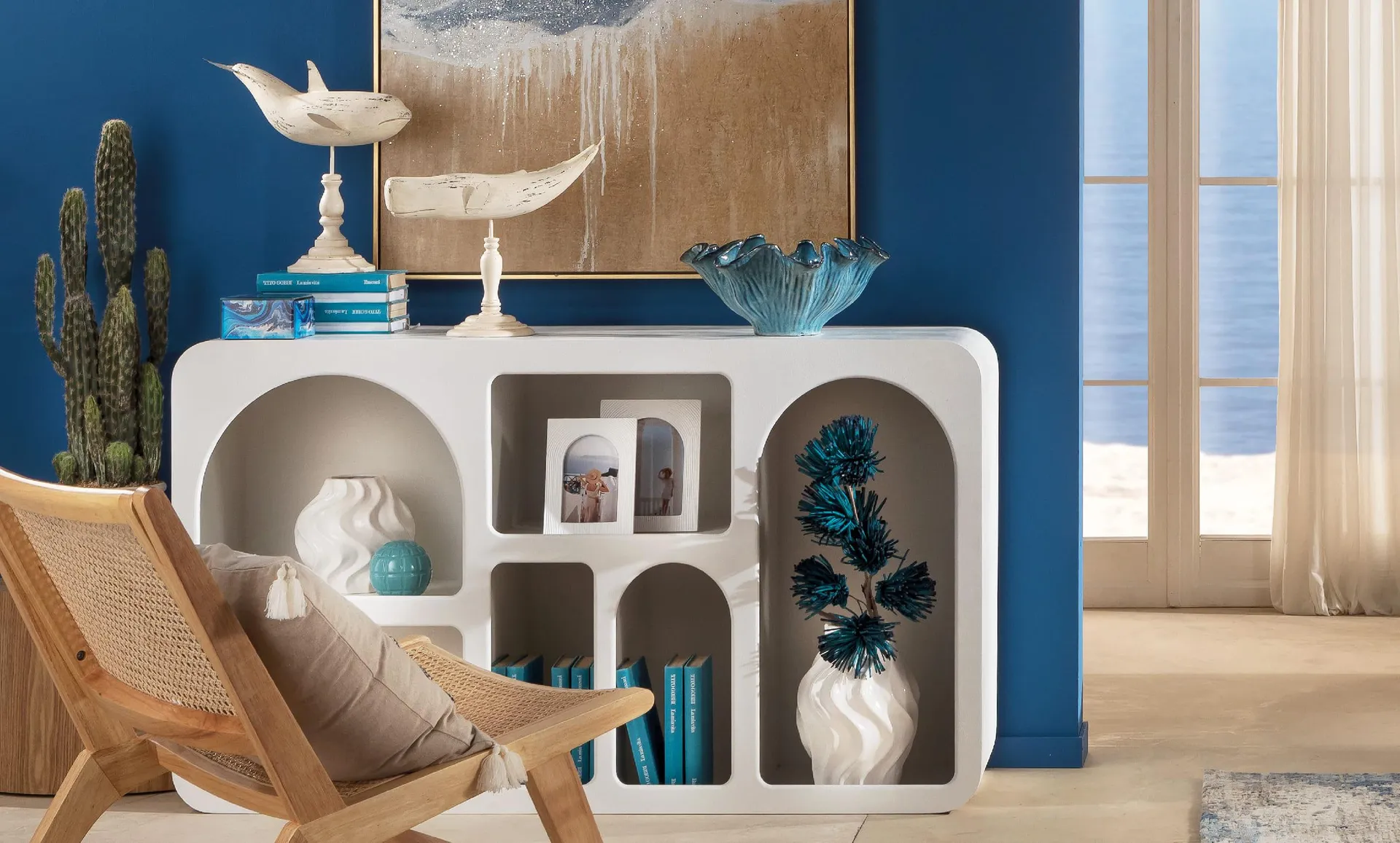Una consolle, ad esempio, può diventare una micro-architettura domestica progettata per creare ritmo, p****ause, pieni e vuoti. Come in questo mobile bianco, scavato da arcate morbide come aperture moresche, che è quasi una scultura abitabile. È al tempo stesso contenitore, sfondo e soggetto. Al suo interno non si depositano semplicemente oggetti, ma si compone una narrazione domestica: libri, foto, artefatti marini...