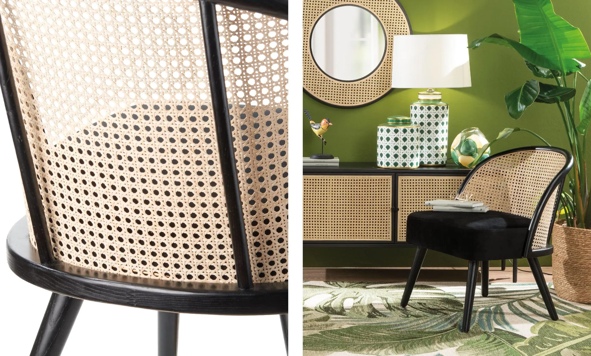 La struttura in legno verniciato nero crea un contrasto grafico deciso con la paglia intrecciata, mentre il rivestimento in velluto aggiunge una nota lussuosa. Ed ecco il perfetto connubio tra tradizione e modernità racchiuso in una sola piccola poltrona.