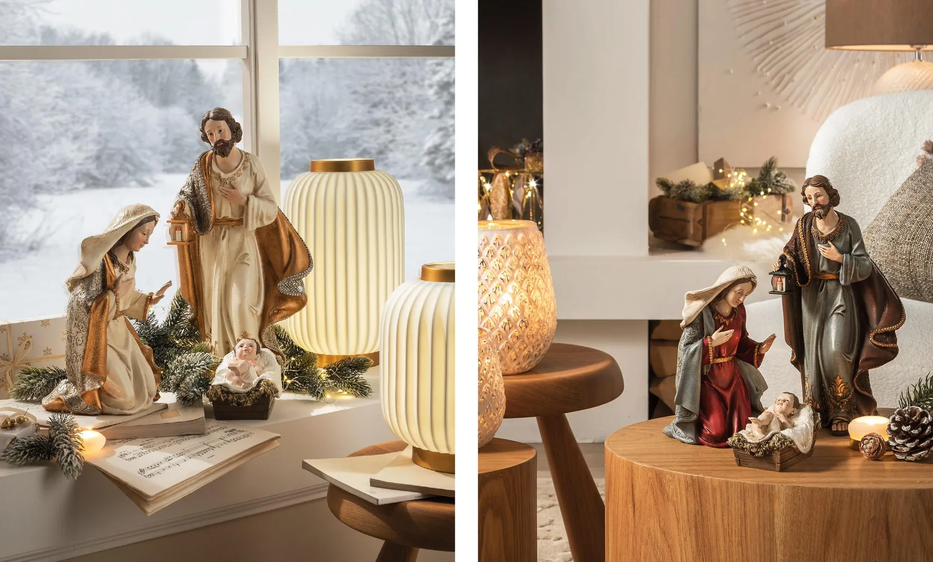 Posizionati su una base in pietra, i tre personaggi principali catturano lo sguardo con la loro semplicità e grazia. Perfetti se accompagnati da un’illuminazione delicata e un uso sapiente di candele e punti luce che possano aggiungere un tocco moderno senza compromettere l’atmosfera classica.