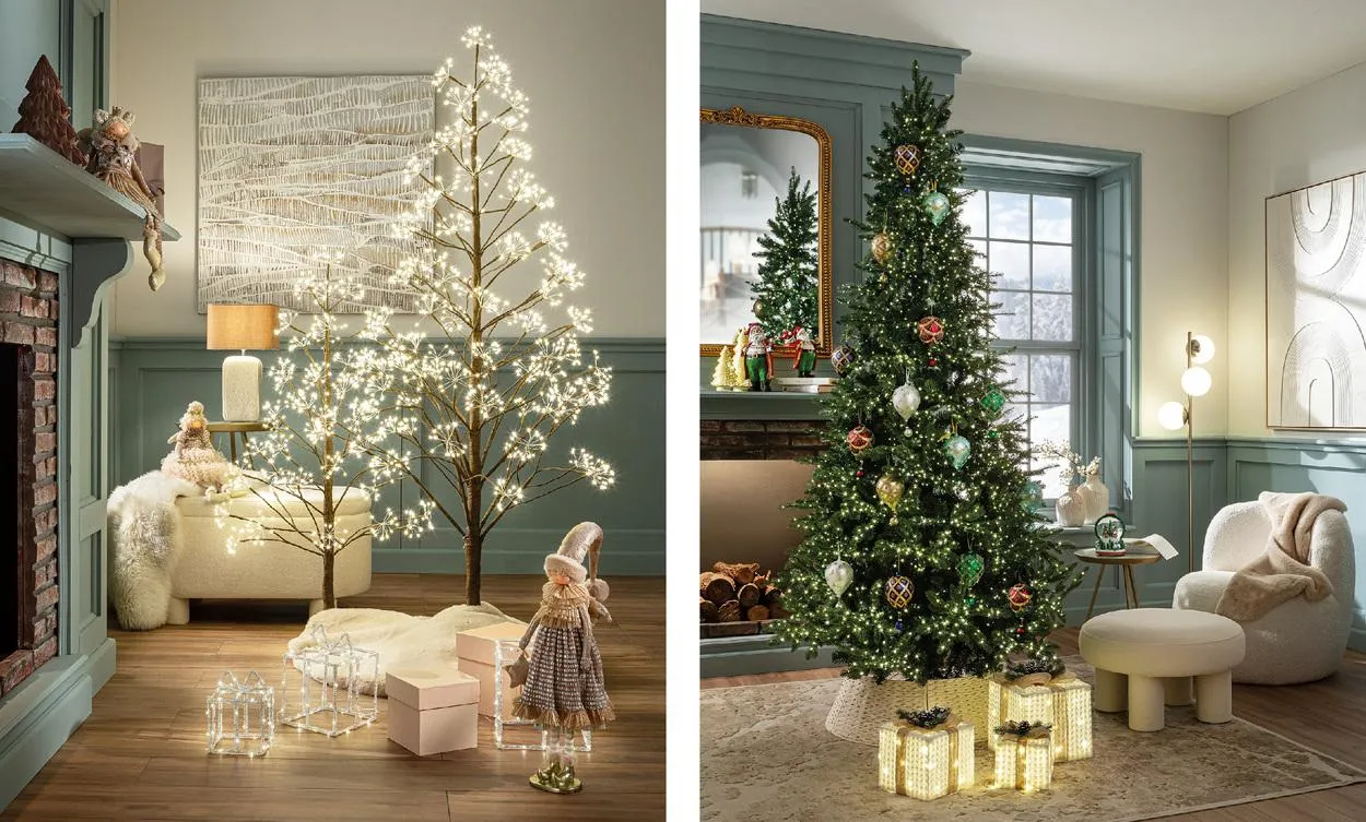 - si inizia con un’illuminazione di base che deve avvolgere l’intero allestimento: le luci a micro-led, integrate in elementi come alberi decorativi o ghirlande luminose, sono ideali per dare un effetto caldo e avvolgente perché offrono una luce soffusa che può illuminare delicatamente lo sfondo della vetrina, creando un’atmosfera incantata.